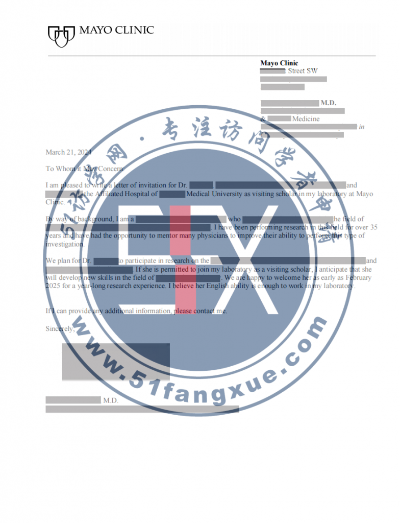 申请过程出奇地顺利,自2月初启动申请以来,仅仅不到一个月的时间,H医生便收到了部分院校的面试邀请。经过精心及准备和出色的表现,H医生终于在3月中旬成功获得了梅奥诊所访问学者邀请函,这标志着她在学术道路上又迈出了坚实的一步。