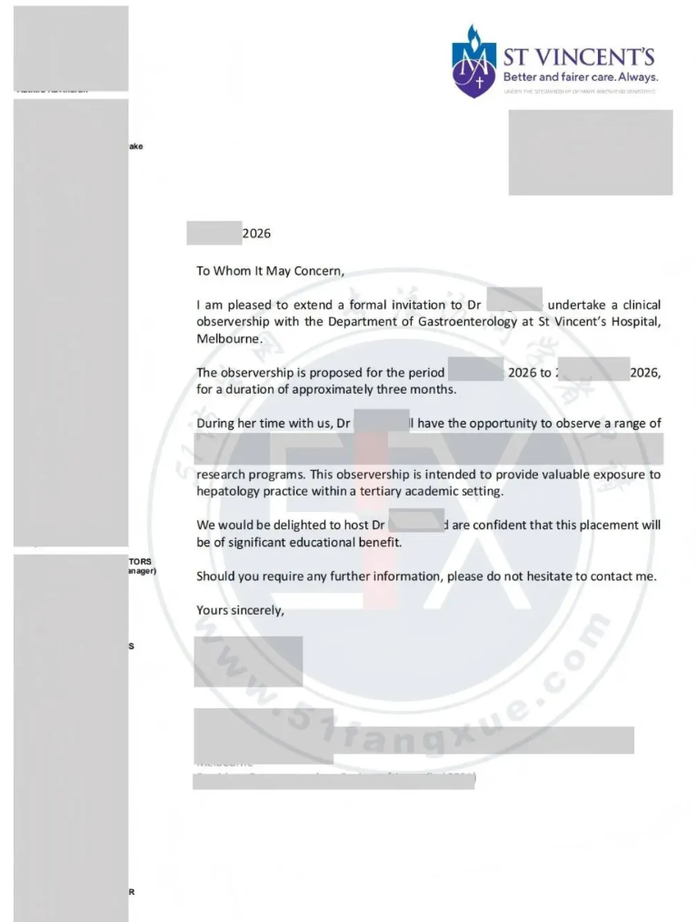 2026 年,又一位国内临床医生实现海外访学目标 —— 来自三甲医院的肝病专业 F 医生,在51访学网全程支持下,顺利拿到澳大利亚墨尔本圣文森特医院访问学者邀请函,正式开启国际临床与科研交流之路。