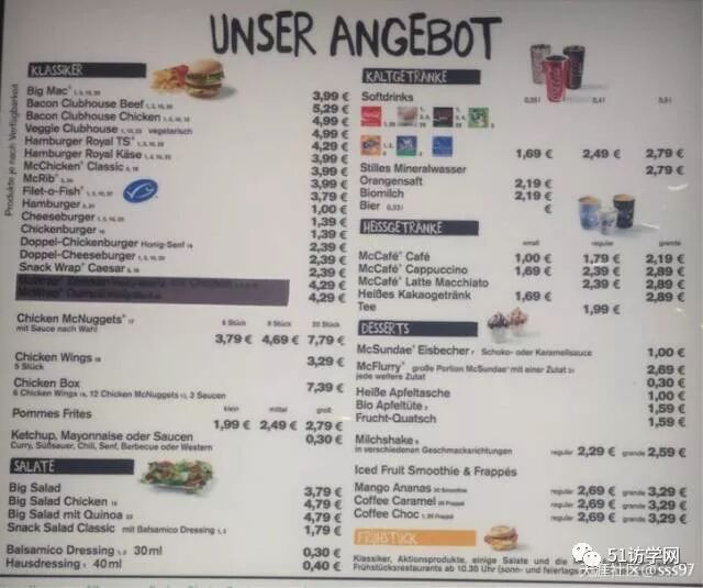 还是会经常光顾麦当劳,因为不存在点菜障碍,普通汉堡4-5欧左右,一个套餐8欧左右;可乐比较贵,中杯2.5欧;
