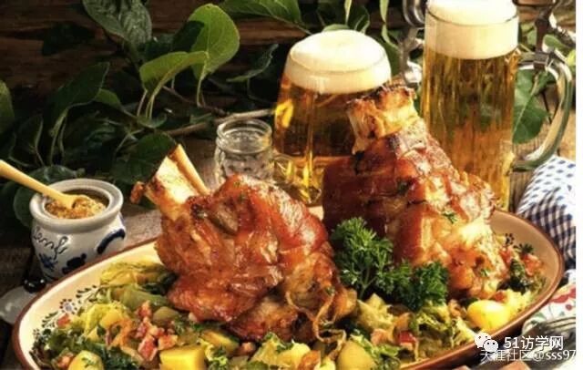 德国人超级爱吃猪肉,烤大肘子配啤酒是德国餐厅的招牌菜,一个人20欧左右。