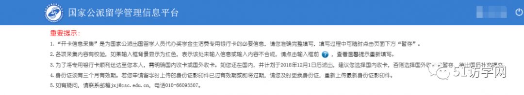 现因办理专用银行卡需要,须补充和校准留学人员的部分信息。即日起,请您登录国家公派出国留学管理信息平台(https://s.csc.edu.cn),直接在“开卡信息采集”页面,准确填报个人相关信息,并注意以下事项: