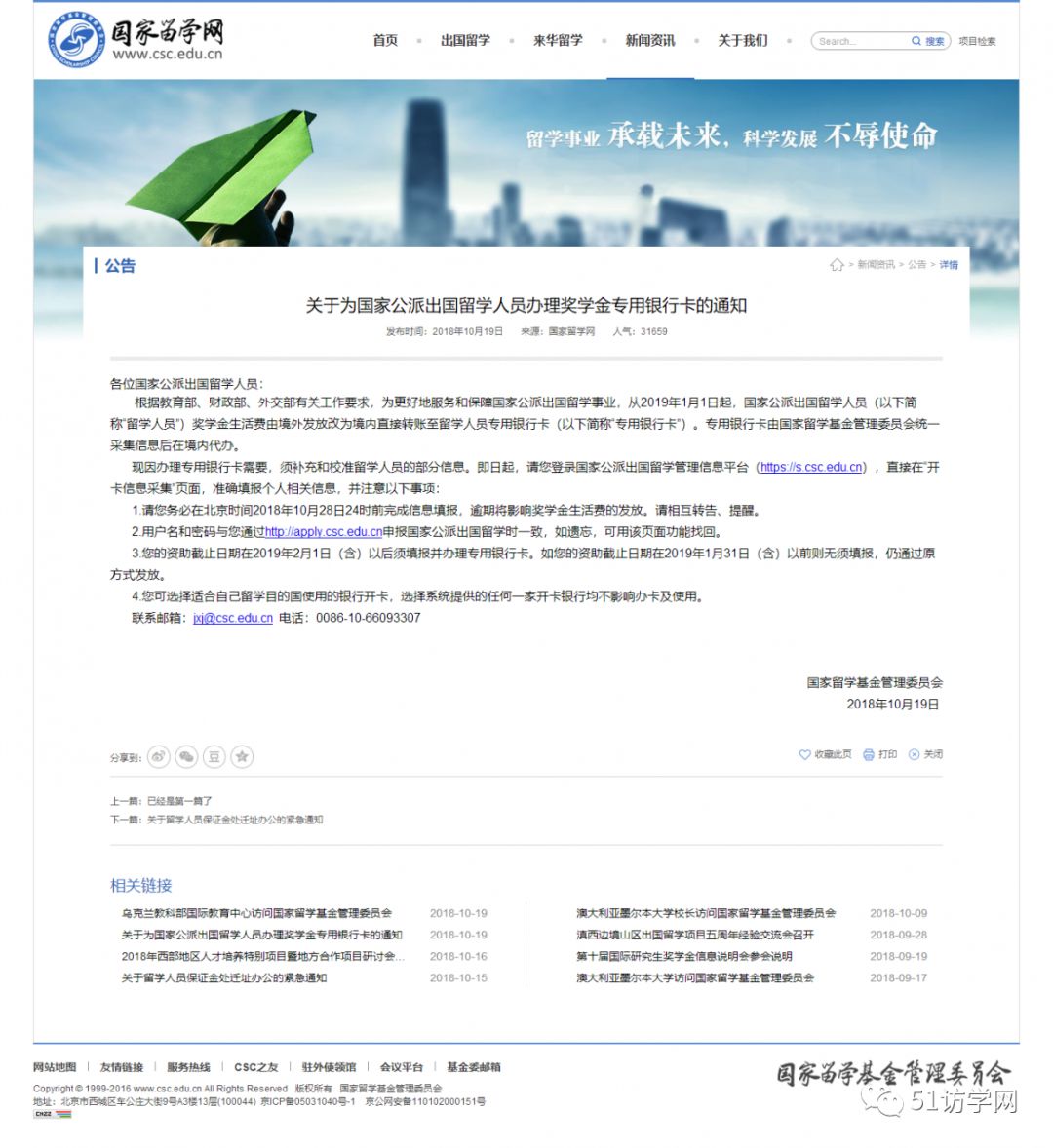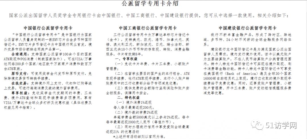 根据教育部、财政部、外交部有关工作要求,为更好地服务和保障国家公派出国留学事业,从2019年1月1日起,国家公派出国留学人员(以下简称“留学人员”)奖学金生活费由境外发放改为境内直接转账至留学人员专用银行卡(以下简称“专用银行卡”)。专用银行卡由国家留学基金管理委员会统一采集信息后在境内代办。
