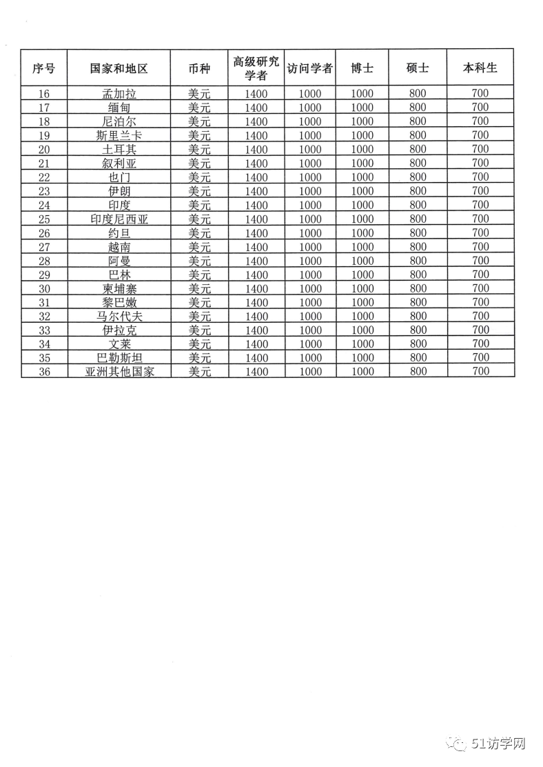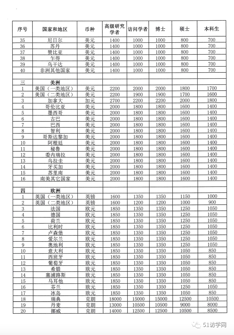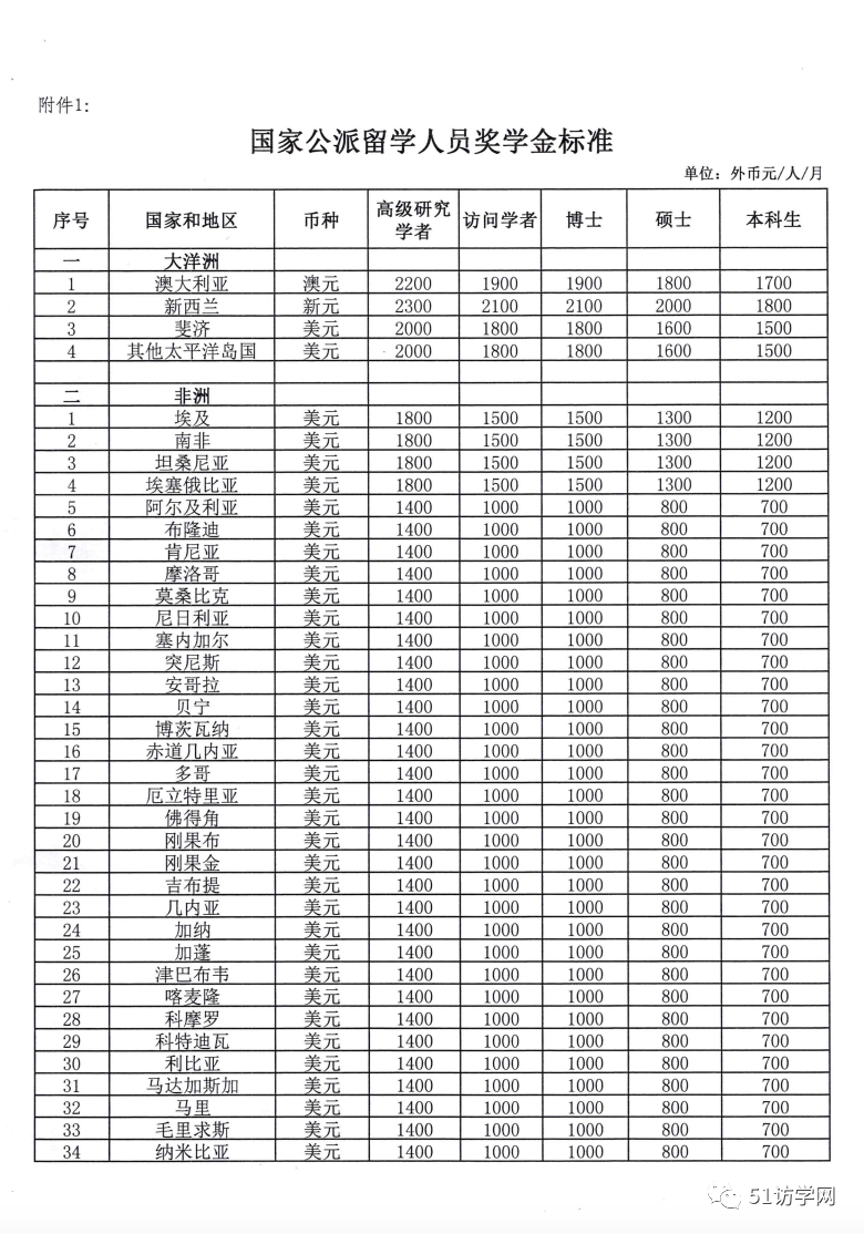 国家公派留学人员奖学金标准 外币元/人/月