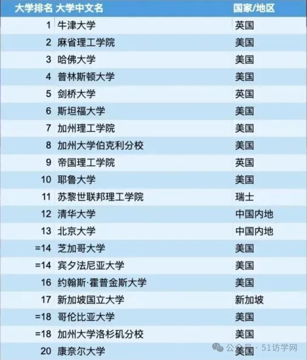 而同一排行榜Top10的学校中,美国有7所,英国3所。牛津,哈佛,剑桥,斯坦福,麻省,加州理工,普林斯顿,耶鲁等……可以说代表着各界学者对于名校的向往。