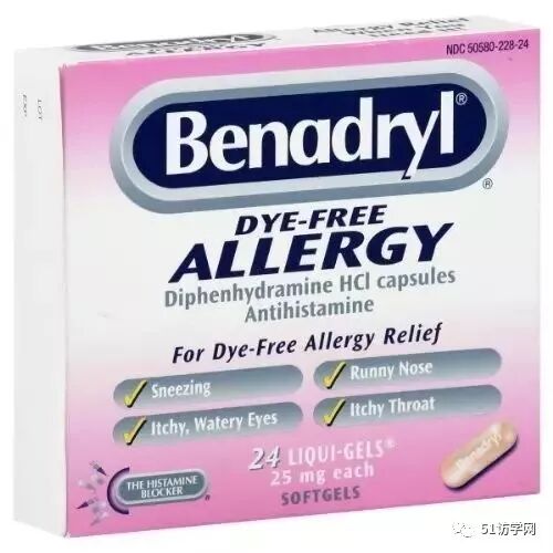 Benadryl Dye-Free Allergy Reliefs:缓解打喷嚏、流鼻涕、喉咙发痒、眼睛发痒等症状。
