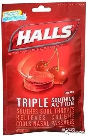 Halls Mentho-Lyptus Drops Cherry:薄荷糖,缓解咽痛、咳嗽,舒缓鼻腔不适。