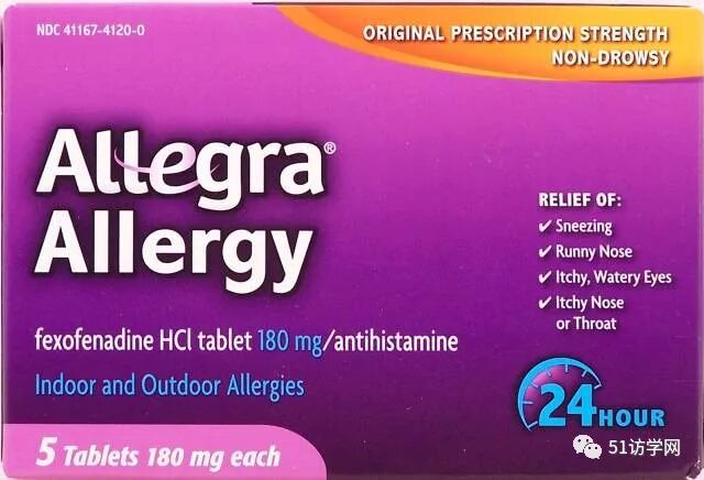 Allegra Allergy Fexofenadine HCI Tablets :用于缓解打喷嚏、流鼻涕、鼻子痒、喉咙痒等过敏症状。