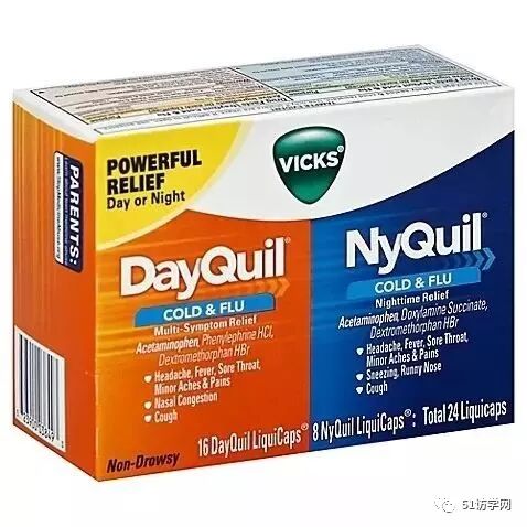 Vicks Dayquil And Nyquil Combo Pack Cold & Flu Relief:缓解酸痛、咽痛、发烧等综合感冒症状,分为日间配方和夜间配方;日间配方不瞌睡。