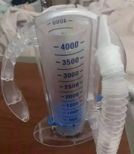 在美国,医生用呼吸训练计量器来改善术后病人肺功能。瓶体有标记,记录每次吸入和吐出的气量。通过慢慢而深深地吸气,之后停留2-6秒再呼出,有帮助病人打开肺泡机体的功能。该设备常用于肺炎、肋骨损伤恢复的病人,帮助病人减少胸水发生的几率。
