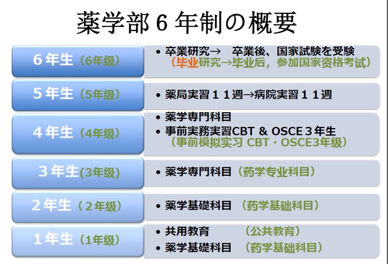 日本由药学会针对六年制药学教育制订了药学教育标准课程,主要分为5部分:1.人文类课程;2.入门课程;3.药学专门教育课程;4.实践实习;5.毕业实习。