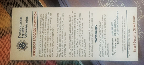 当然,若美国海关抽检了你的行李箱,他们会放一张行李检查单(NOTICE OF BAGGAGE INSPECTION)在你的行李箱里面,你打开行李箱可见,如下图: