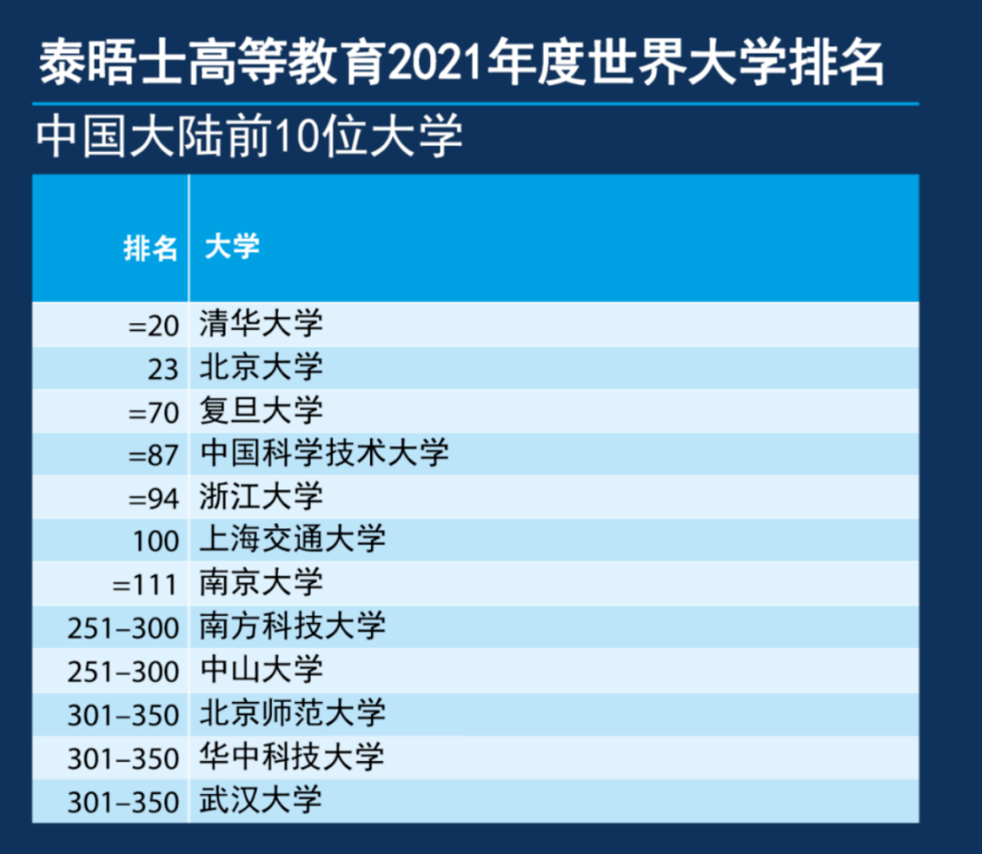 在大陆排名榜单中,清华大学位居榜首;北京大学紧跟其后;第三名是复旦大学。