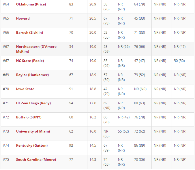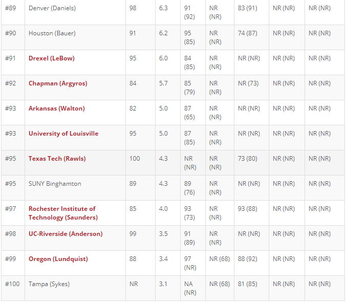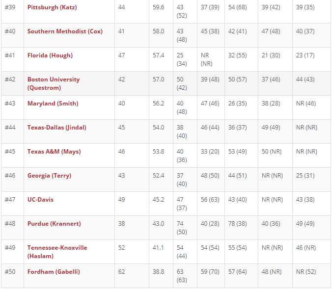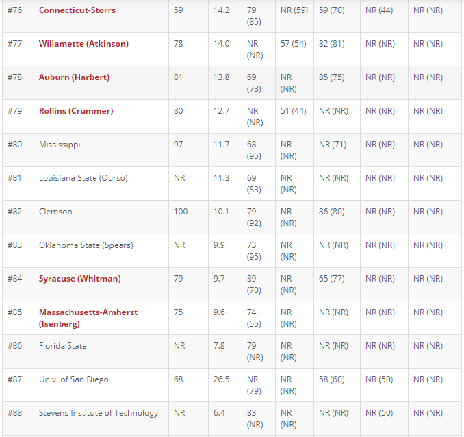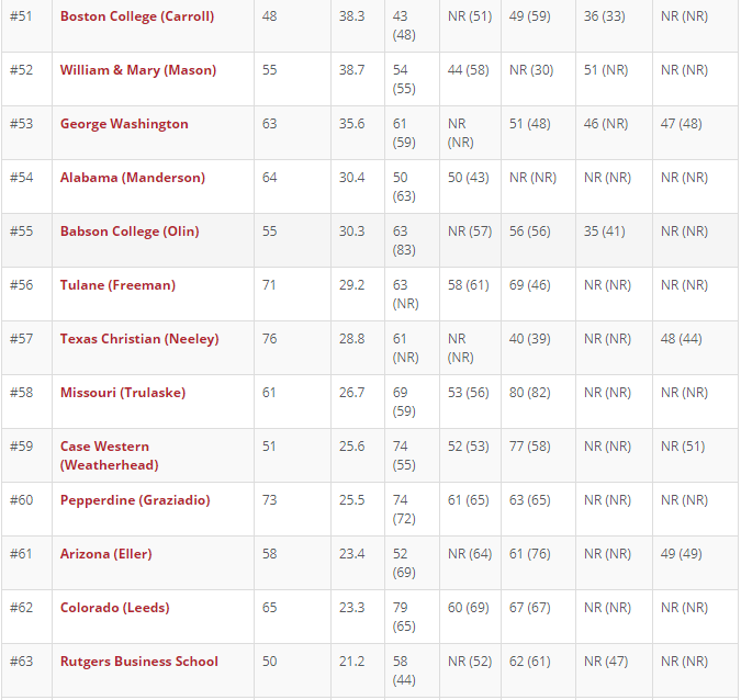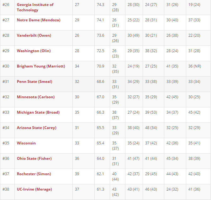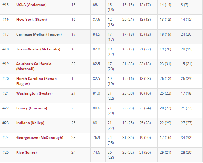 西北大学的凯洛格管理学院与去年一样都是第5名,宾大沃顿商学院作为去年的并列第1,今年下降了3位,位居第4。耶鲁大学管理学院再次跻进前十,比去年提升了一个名次,排名第10,取代了去年的密歇根大学罗斯商学院(今年第12)。
