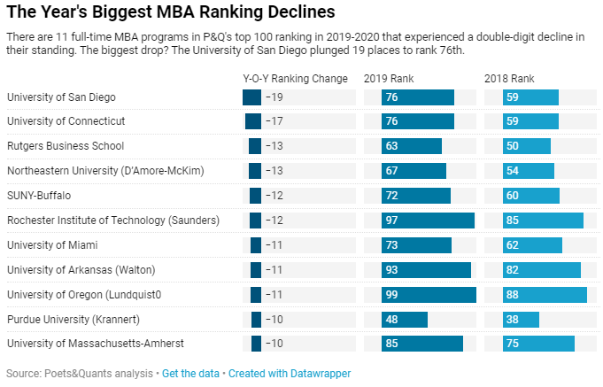 那么在本次排名中,有不少学校的排名出现了大幅下降的情况。其中,属圣地亚哥大学最惨,从去年的59名掉到了今年的76名,其他学校如下:
