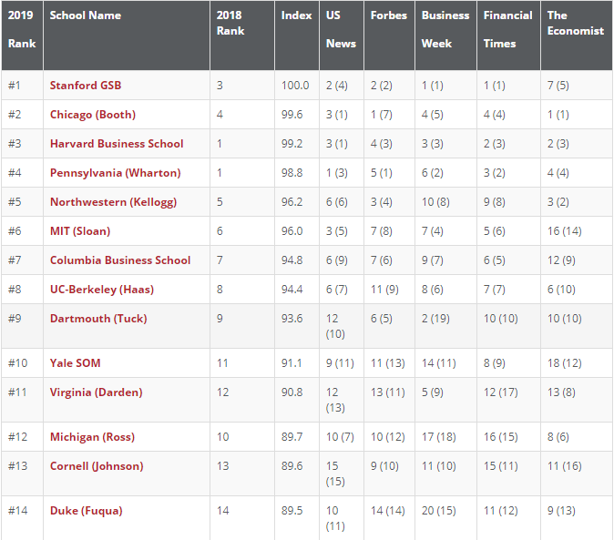 美国著名网站POETS & QUANTS(简称P&Q)发布最新2019-2020全美商学院MBA排名。这是该网站发布的第10版权威排名,该项排名被美国各大学校及公司普遍接受,其影响力巨大。