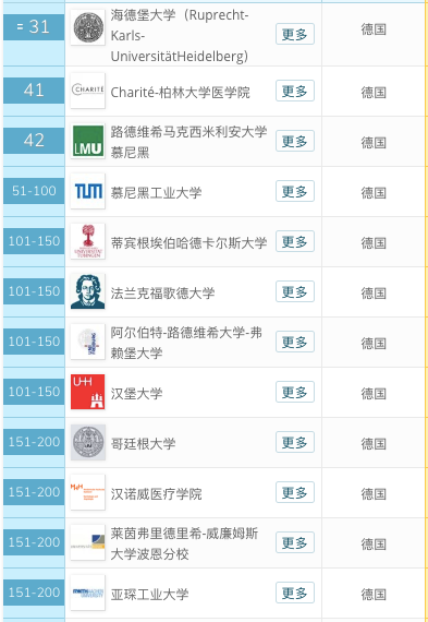 很多医护人员从德国进修回来后对德国的医疗都颇为赞赏!海德堡大学在德国医学专业中排名第一,还有大家很关注的柏林大学医学院和慕尼黑工业大学始终处于领先地位!8所进入了150名,12所进入了200名。