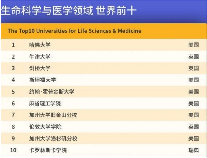 美国大学占据了大半壁江山,生命科学与医学领域世界前10占据6所,有哈佛大学、斯坦福大学、约翰·霍普金斯大学、麻省理工学院、加州大学旧金山分校、加州大学洛杉矶分校等;英国占据3所;瑞典占据1所。具体如下: