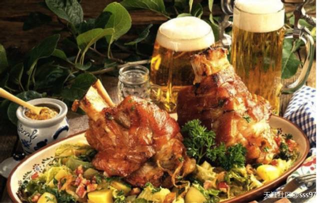 德国人超级爱吃猪肉,烤大肘子配啤酒是德国餐厅的招牌菜,一个人20欧左右。