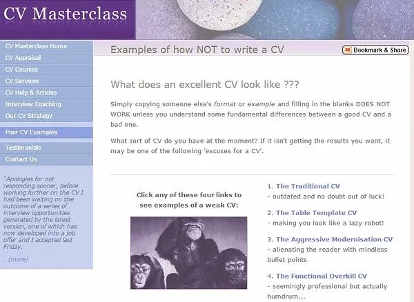 CVMasterclass提供的简历类型较多,可以根据个人求职的岗位类型及个人风格偏好,选择简历模板。此外,网站上还会提供一些反面的简历素材。